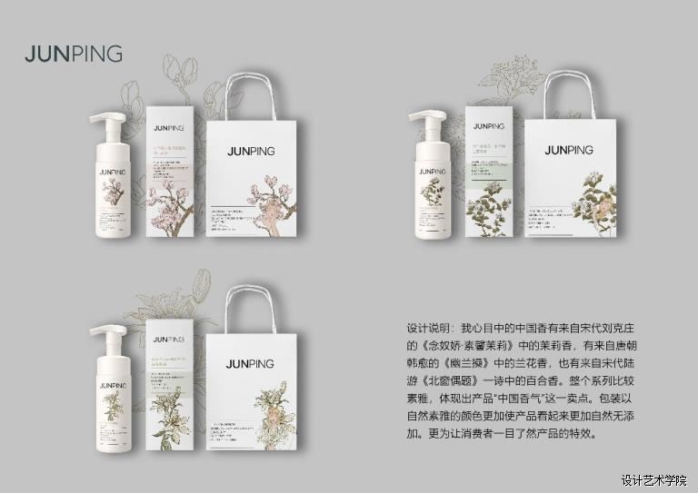 设计说明: 我心目中的中国香有来自宋代刘克庄的《念奴娇·素馨茉莉》中的茉莉香,有来自唐朝韩愈的《幽兰操》中的兰花香,也有来自宋代陆游《北窗偶题》一诗中的百合香。整个系列比较素雅,体现出产品“中国香气”这一卖点。包装以自然素雅的颜色更加使产品看起来更加自然无添加。更为让消费者一目了然产品的特效。