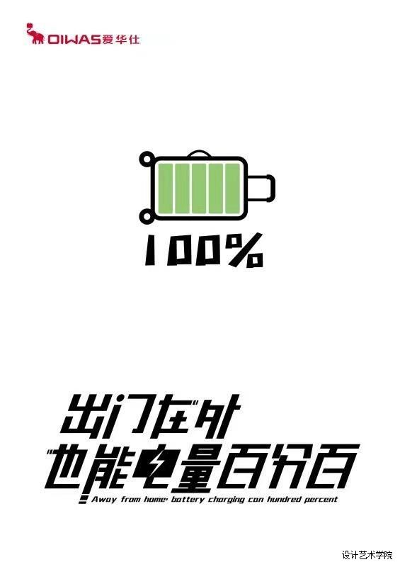 设计说明:从爱华仕箱包的卖点之一“原创USB充电脚座,适配多种充电设备,实现边走边充”出发进行创作,将电池与箱包结合来体现这一卖点。