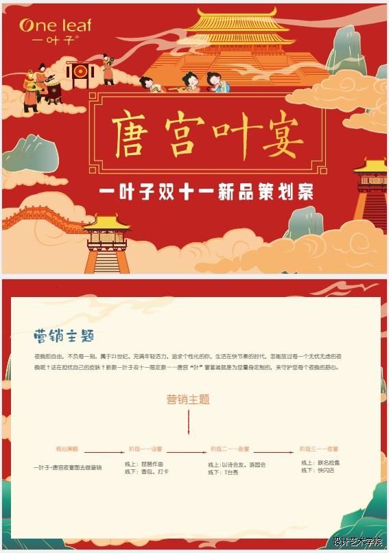 设计说明:每一个夜晚我们进入自由世界,同时也充满活力、追求个性、热爱冒险。本次策划案主要从设宴、赴宴、夜宴三个方面出发,以三款乐俑瓶身作为主打产品,并且采用了唐宫夜宴图中的乐佣们为主要形象代表,并结合唐朝的妆容以及服饰为瓶身的设计增光添彩,在刘芳君老师和贺媚芳老师的指导下,根据唐宫夜宴的主题,反复修改策划案,计划打造双十一专属一叶子的独特“叶”宴,使消费者感受到我国的历史和文化。