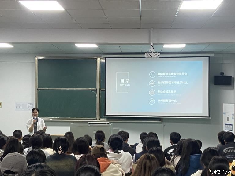 为更好地帮助23级新生更快更好地投入新阶段的学习和生活,10月19日晚19:00,数字媒体教研室举办了23级数艺新生专业教育会。专业负责人马妮副教授作为主讲人,向新生们详细介绍了数字媒体艺术专业,讲座围绕5个内容展开——数艺专业是什么,数艺专业学什么,数艺专业怎么学,数艺专业的就业情况以及专任教师建议等。