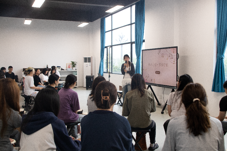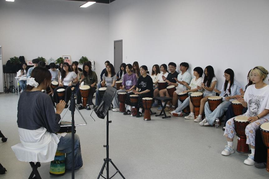 活动开始,陈紫依老师为参与者演示了基础节奏型,带领大家开启节奏初体验,让学生们初步感受非洲鼓的魅力。在“情绪节奏圈”环节,学生们用鼓声表达愤怒、喜悦等各种情绪,其他同学猜测并展开讨论,为情绪找到了新的出口。团体即兴创作环节中,学生们分声部演奏复合节奏,在倾听与配合中,团队协作能力和归属感得到了增强。活动最后,在冥想收尾环节,学生们闭眼轻抚鼓面,感受振动与呼吸同步,让身心得到了深度放松。