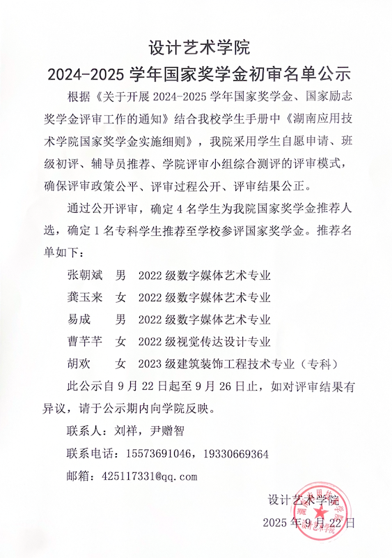 设计艺术学院2024-2025学年国家奖学金初审名单公示