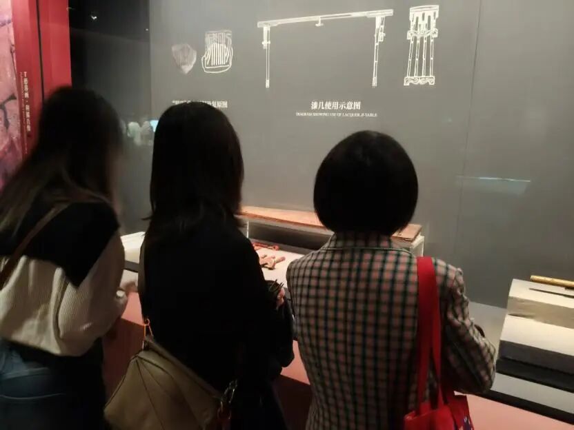 在马王堆汉墓展区,漆木器、丝织品、随葬兵器等珍贵文物有序陈列,直观呈现了西汉时期贵族人群的生活情况,同时体现出了汉代工艺美术的制造技艺与审美水平。教师团队成员们驻足在每一件文物前,仔细端详着文物上的图案、色彩与造型,探讨着如何将这些传统元素融入到现代视觉传达设计之中。从漆木器上精美的云气纹,到丝织品上绚丽的色彩搭配,再到随葬兵器上独特的装饰风格,都成为了教师值得思考的焦点。