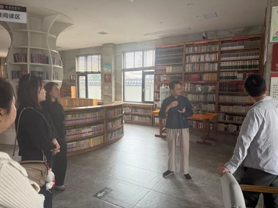 逸迩阁书院于2018年开院,是国内已知最大的民办公益图书馆。在书院负责人的陪同下,视传教师一行对书院的各个区域都进行了实地考察,了解了逸迩阁书院的现状和发展情况,重点听取关于馆藏水陆画的具体介绍,水陆画起源于三国时期,是“三教合一”大背景下产生与发展的民俗文化现象。水陆画是水陆法会上供奉的宗教人物画,于2014年被列入第四批国家级非物质文化遗产代表性项目名录。逸迩阁现藏有水陆画4000多幅,画作画工精湛细腻,教师们与书院相关负责人针对水陆画的题材内容、文化特征、制作工艺、 传承现状等内容进行了深度交流。