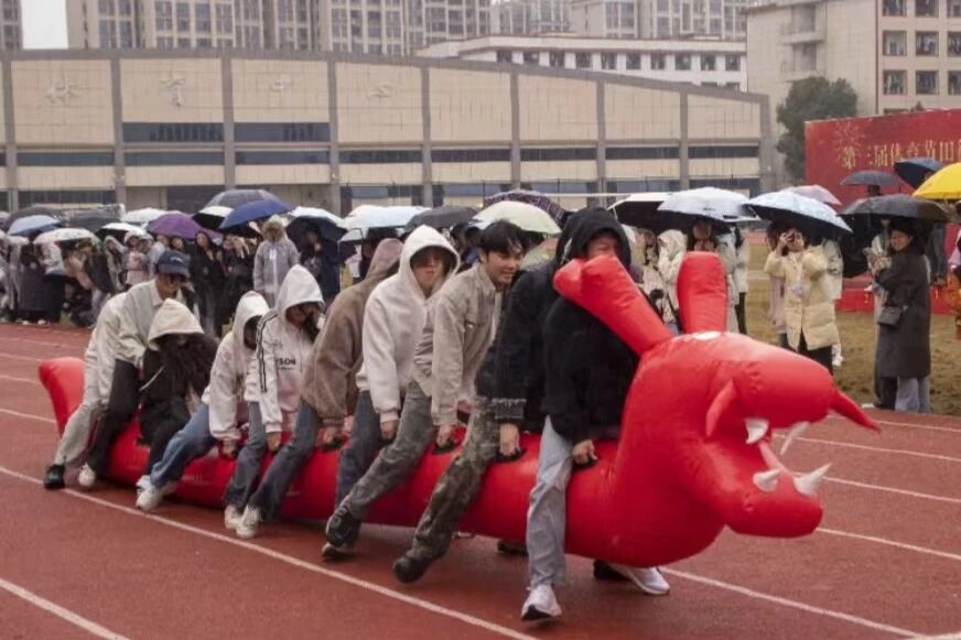 从运动项目中,让我们看见那坚持到底的决心,老师们更是卸下平日工作里的压力,全力以赴,场边同学为他们欢呼加油,在那一刻没有师生关系之分,只有朋友间的胜负心。而旱地龙舟作为最后一个比赛项目更是将比赛氛围推入高潮,同学们团结一致,共抬脚步,齐喊口号,努力向前,不管速度是快或者是慢,和天气的好坏,大家都没有放弃,脸上洋溢着笑容,向着终点前进。