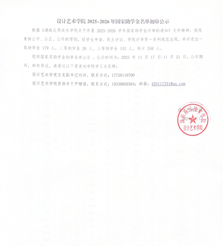 设计艺术学院2025-2026年国家助学金名单初审公示